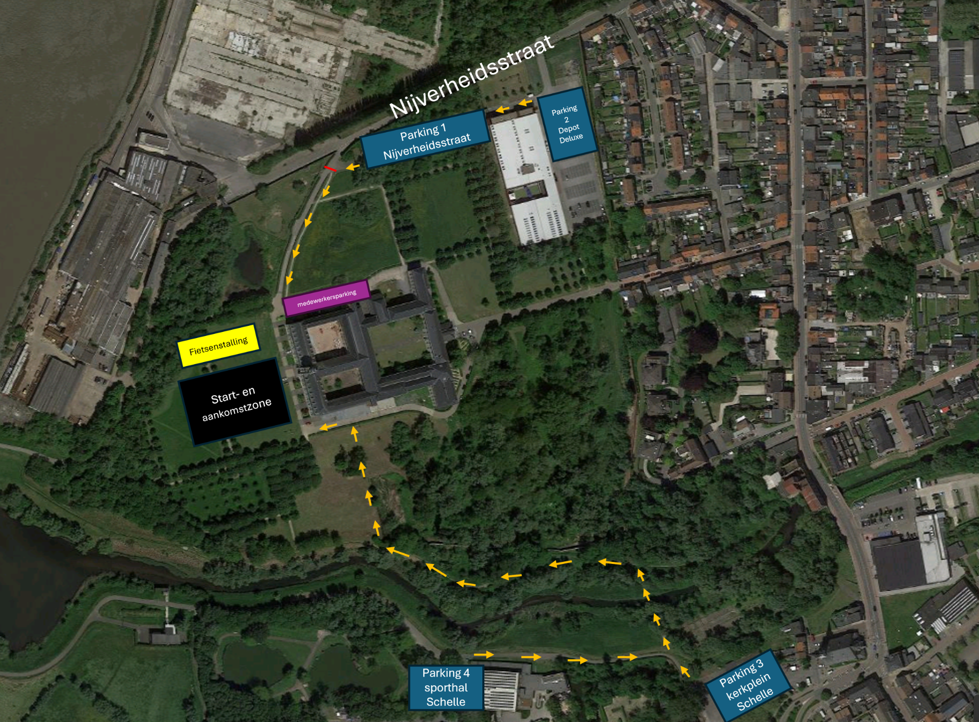 - Aan de sporthal van Schelle (GPS: Parklaan 3, Schelle) 700m tot de start.